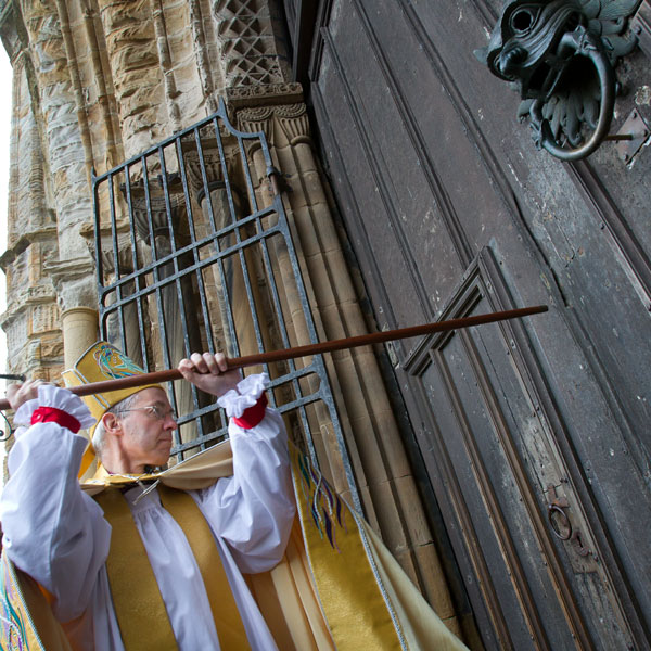Photo credit: (Bottom) Bishop Justin Welby knocks at the doors of Durham Cathedral during his installation ceremony last year. Credit: RNS photo courtesy Durham Cathedral